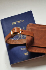 The strap wraps fully around your suitcase handle and threads back through a solid brass buckle, ensuring both security and understated elegance.